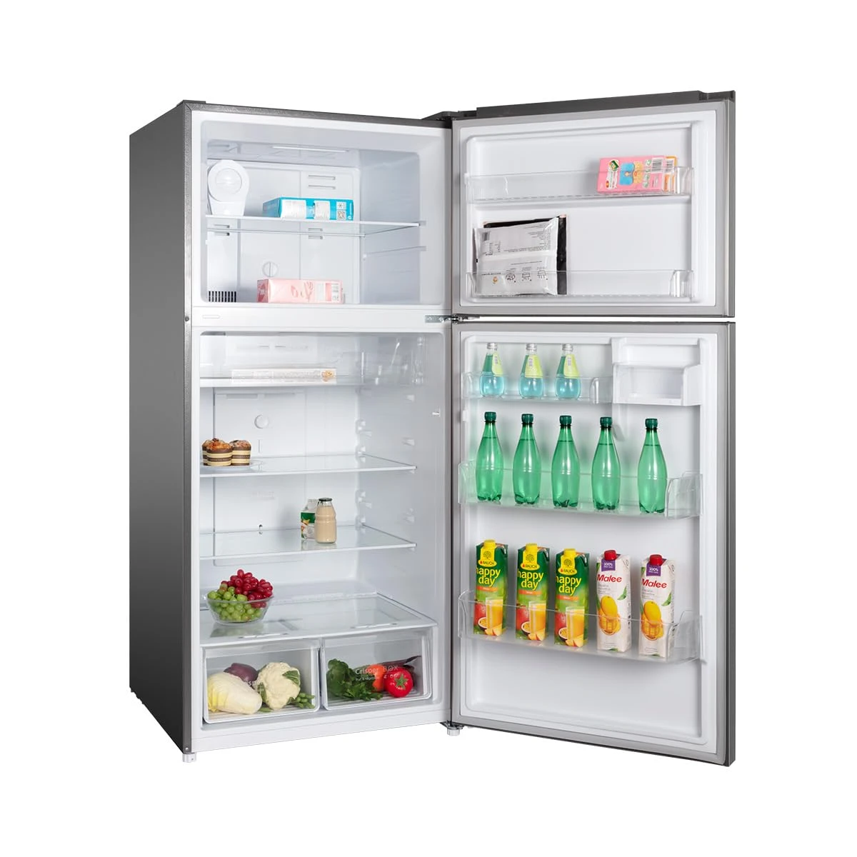 يأتي تصميم الثلاجة بفريزر علوي كبير، بينما يمنحك القسم السفلي مساحة تخزين منظمة وواسعة لحفظ الخضروات، الفواكه، العصائر، والوجبات اليومية.