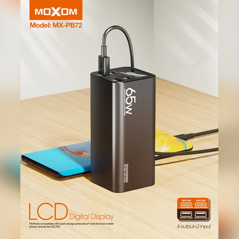 يقدم باور بنك موكسوم PB72 (MX-PB72) أداءً عاليًا وموثوقًا بفضل سعة 20000mAh وتقنية الشحن السريع بقوة 65W التي تتيح شحن الهواتف والتابلت واللابتوبات الحديثة بكفاءة عالية.