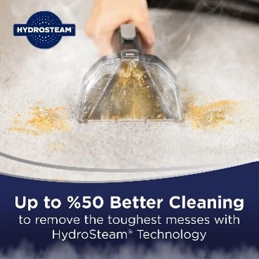 يعمل الجهاز بتقنية هيدرو ستيم التي توفر قدرة تنظيف أقوى بنسبة تصل إلى 50% مقارنة بالأجهزة التقليدية، مما يجعله الحل المثالي للتعامل مع البقع الدهنية، الأوساخ اللزجة، الانسكابات الصعبة، والبقع العميقة داخل الألياف.