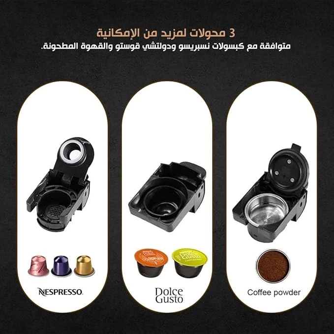 كما تُعد متعددة الاستخدام — تقبل كبسولات متنوّعة بالإضافة إلى مسحوق القهوة، ما يمنحك حرية الاختيار والابتكار.