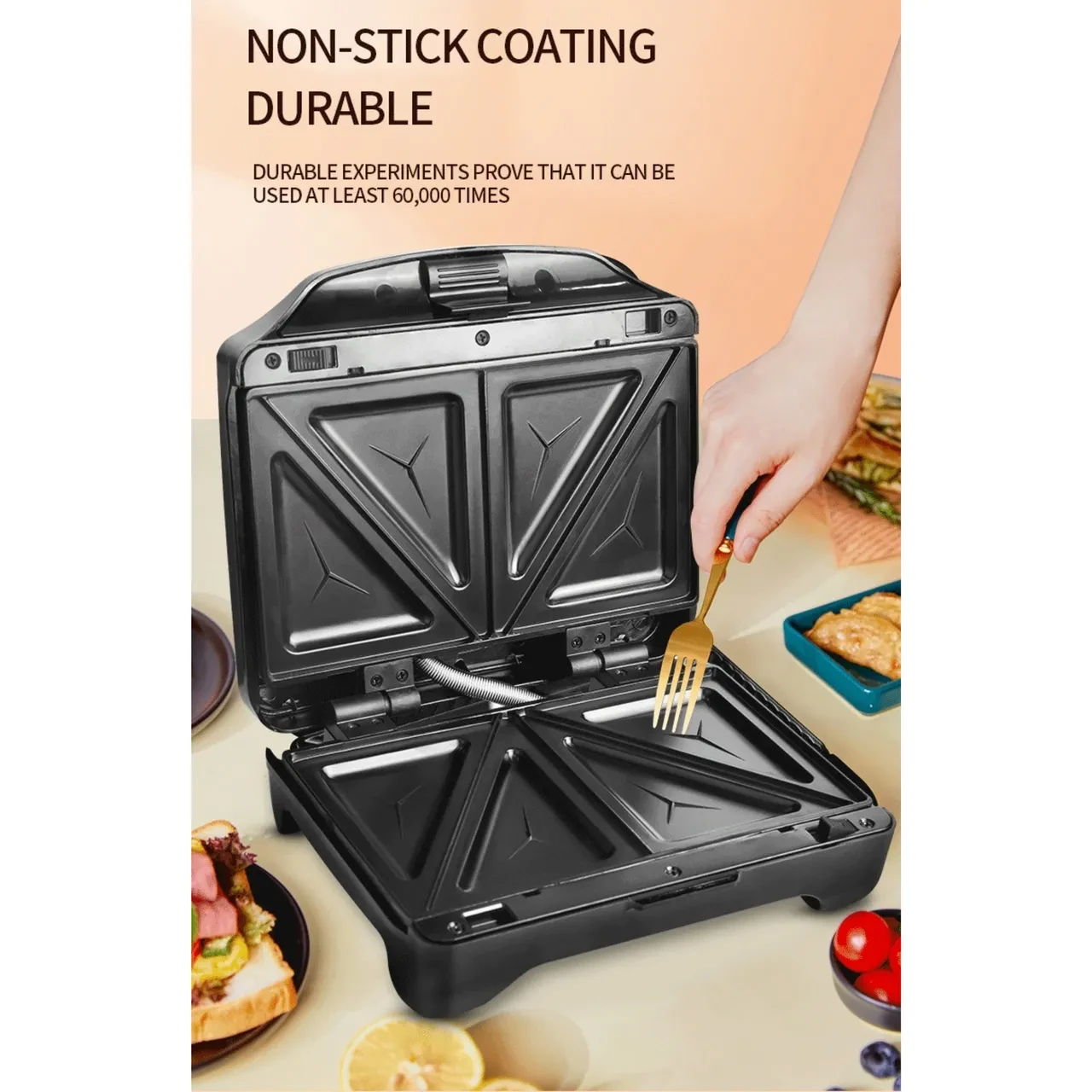 يأتي الجهاز مزودًا بلوحات قابلة للتبديل (سندوتش – وافل – توست)، وبين سطح غير لاصق لتسهيل التنظيف، ومقبض بارد اللمس لضمان الاستخدام الآمن.