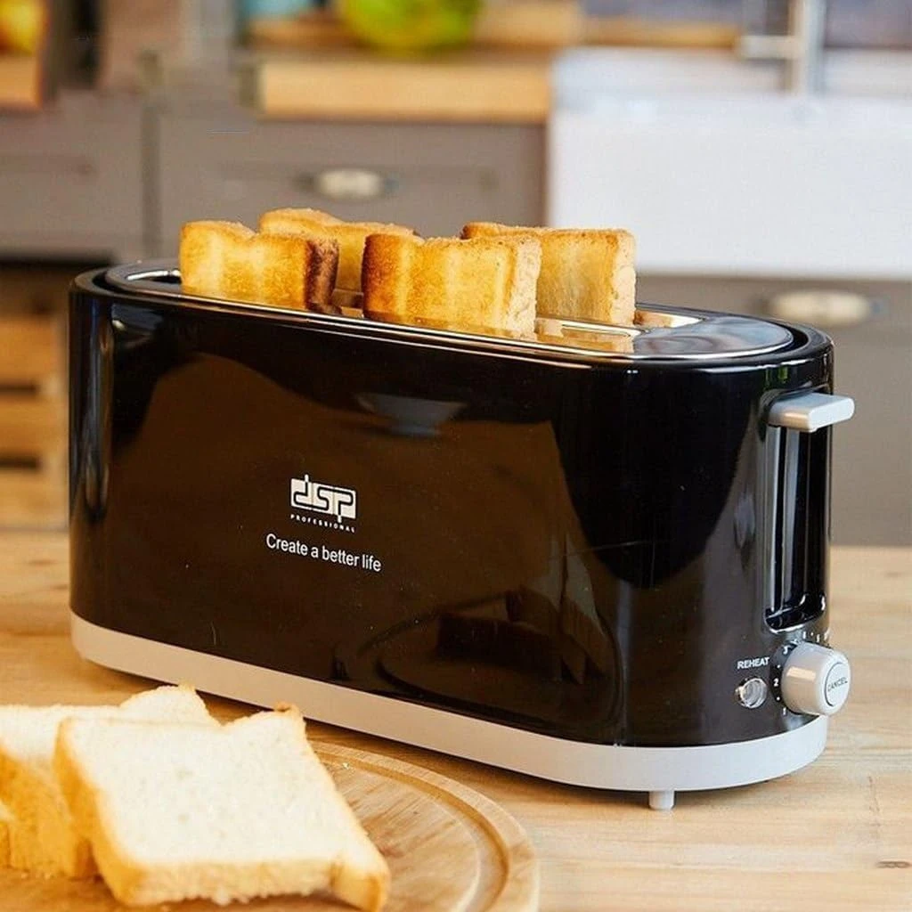 ابدأ يومك بفطور متكامل مع توستر DSP KC2046 الذي يتيح لك تحميص أربع شرائح خبز مرة واحدة بفضل فتحاته الواسعة ومواصفاته العملية.
