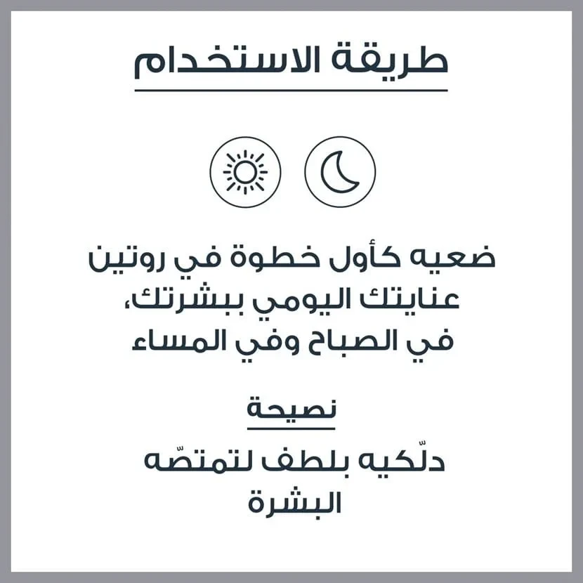 ضعي كمية صغيرة على الوجه والرقبة ووزعيها بلطف حتى الامتصاص الكامل.