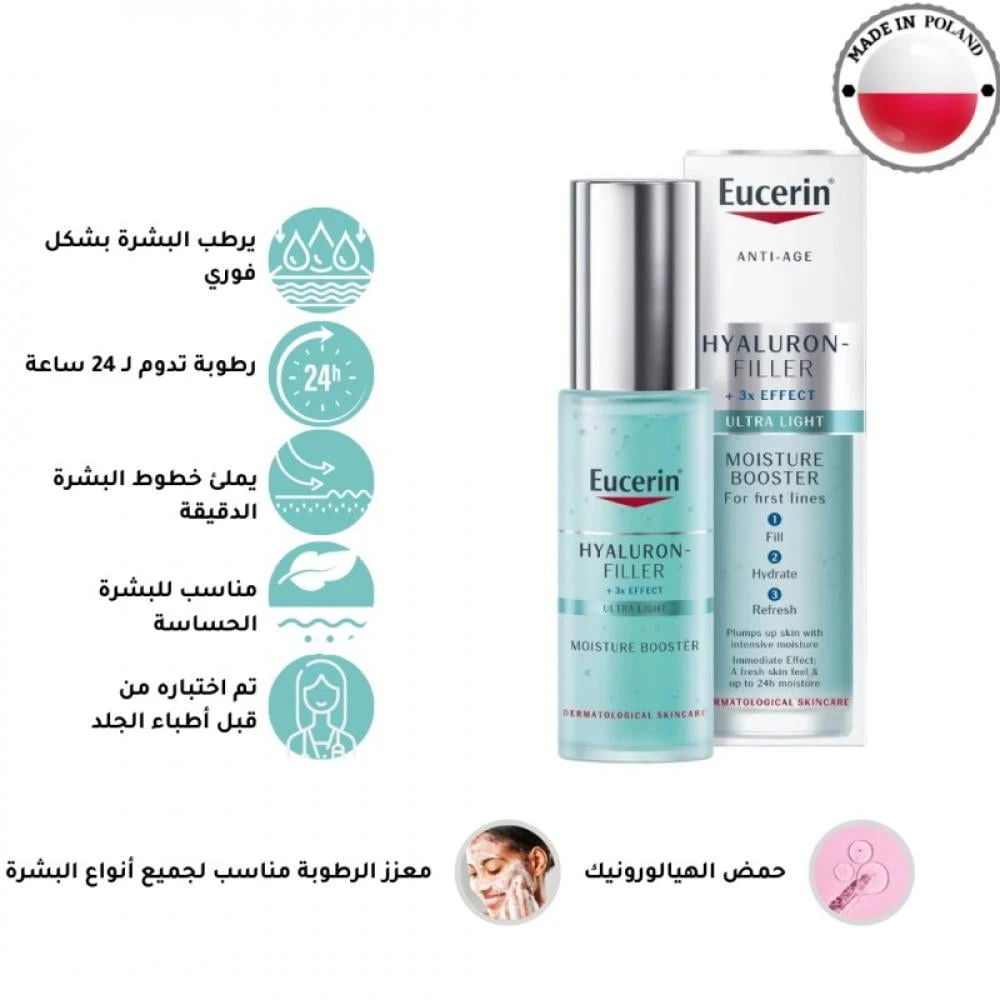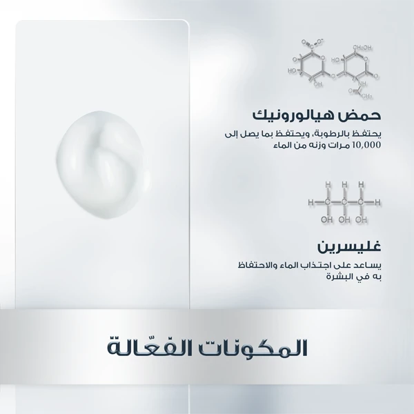 يحتوي على حمض الهيالورونيك بنوعيه (العالي والمنخفض الجزيئات) والجلسرين لامتصاص الرطوبة وتخزينها داخل خلايا البشرة، مما يمنحها امتلاءً وملمسًا ناعمًا ومظهرًا أكثر شبابًا.