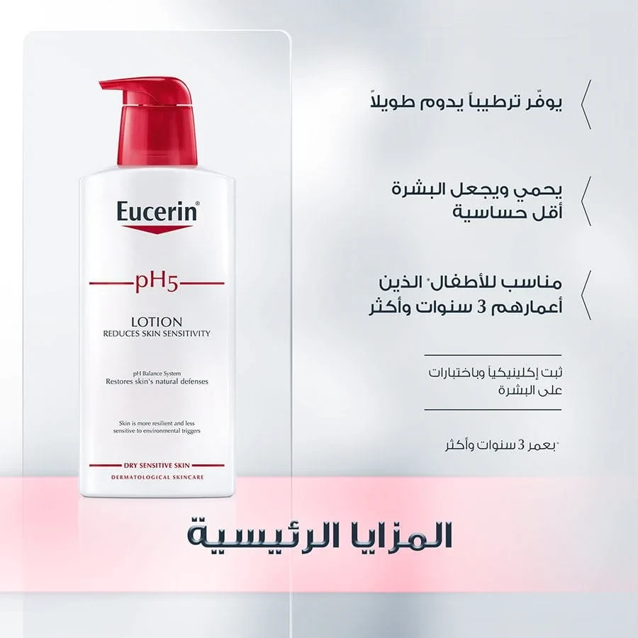 لوشن الجسم Eucerin pH5 مصمم خصيصًا للبشرة الجافة والحساسة، يمنح ترطيبًا عميقًا يدوم حتى 24 ساعة مع تركيبة لطيفة تعيد التوازن الطبيعي للبشرة وتقلل الشعور بالجفاف أو الشد.