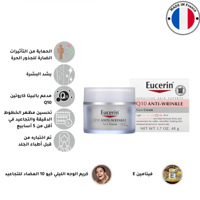 يوصي أطباء الجلد باستخدام كريم Eucerin Q10 صباحًا كجزء من روتين مكافحة الشيخوخة،