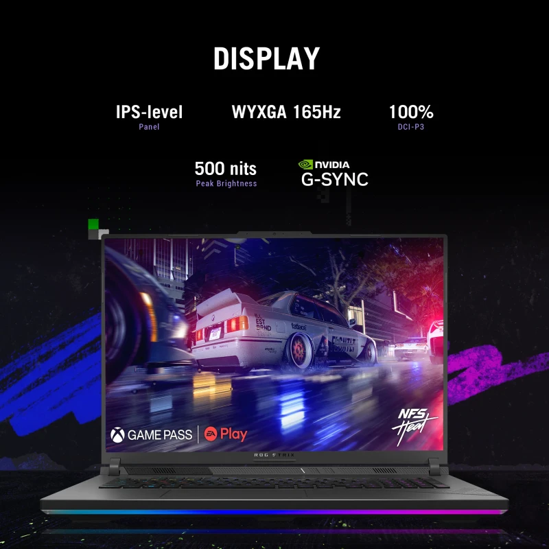يتميز الجهاز بشاشة مقاس 16 بوصة بدقة عالية (عادةً WQXGA 2560x1600) ومعدل تحديث يصل إلى 240Hz، ما يوفر تجربة عرض فائقة السلاسة وخالية من التمزق، وهو ما يمنح اللاعبين ميزة تنافسية في الألعاب سريعة الوتيرة. كما يأتي بذاكرة عشوائية 16GB DDR5 عالية السرعة تضمن أداءً ممتازًا في تشغيل التطبيقات الثقيلة وتعدد المهام دون بطء، بالإضافة إلى وحدة تخزين 1TB SSD (PCIe Gen 4) التي توفر سرعات تحميل وإقلاع فائقة للألعاب والبرامج.